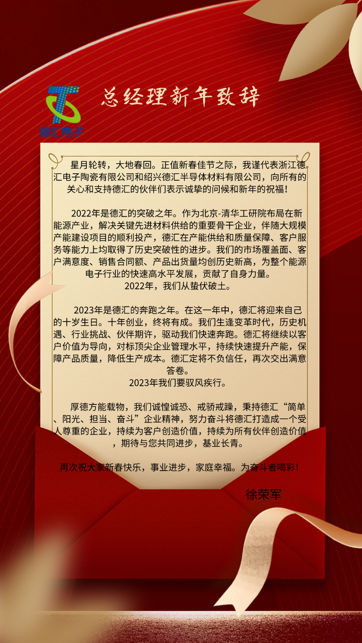 德匯總經(jīng)理徐榮軍發(fā)表2023年新年致辭 2023-01-20 19:25:48 浙江德匯電子陶瓷有限公司 瀏覽次數(shù) 1963 上一條熱烈祝賀德匯電子被評定為高新技術(shù)企業(yè) 下一條喜訊 | 浙江德匯獲得“國家高新技術(shù)企業(yè)”認定